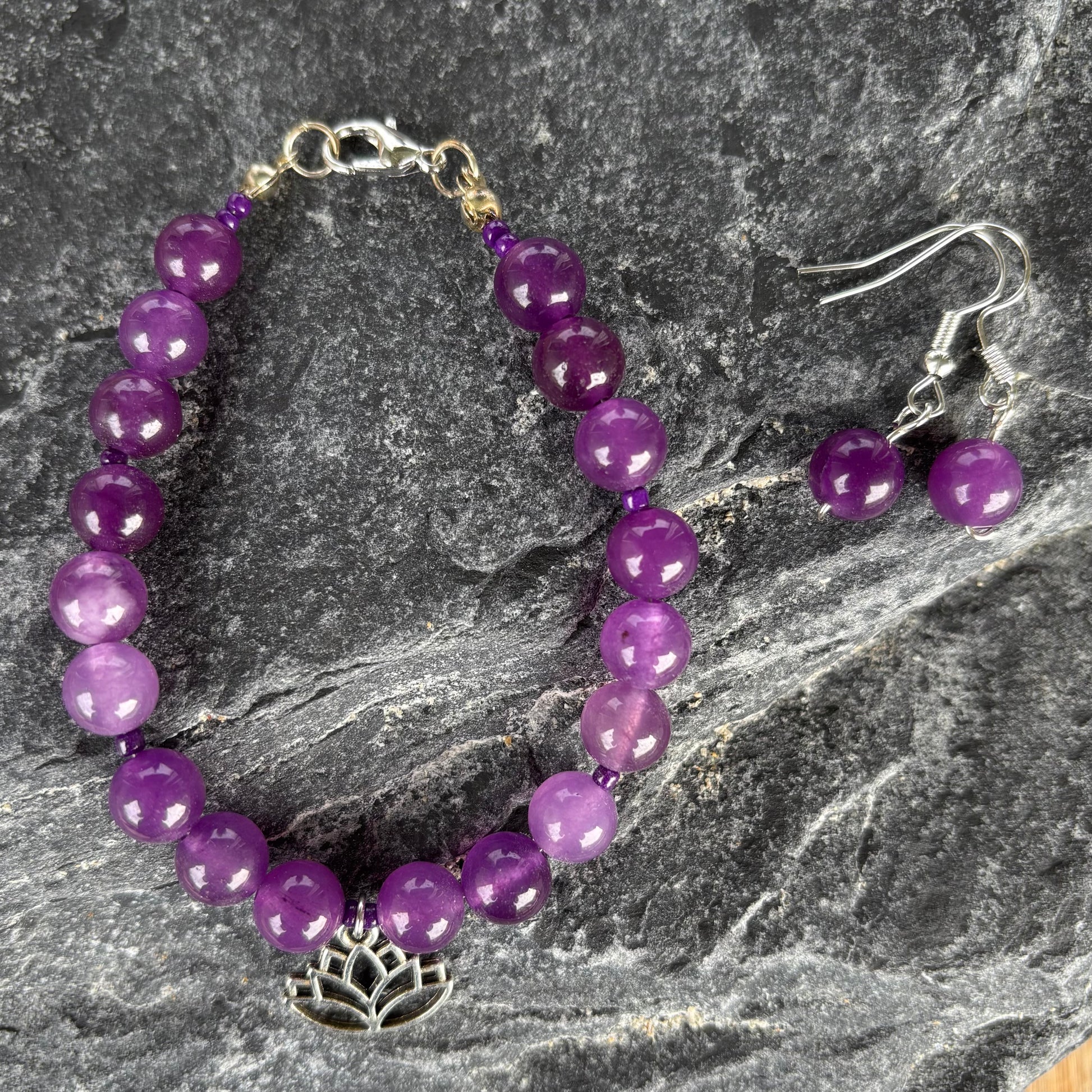 Dieses elegante Set kombiniert ein Amethyst-Armband mit einem silbernen Lotus-Anhänger und einem passenden silberfarbenen Verschluss. Ergänzt wird es durch ein Paar silberne Ohrringe, die jeweils eine Amethyst-Perle tragen. Die harmonische Verbindung von edlem Silber und beruhigendem Amethyst macht das Set zu einem stilvollen Accessoire, das sowohl zu besonderen Anlässen als auch im Alltag getragen werden kann.